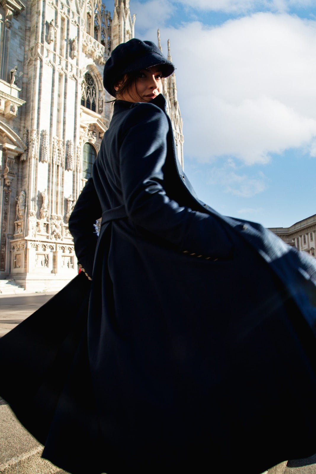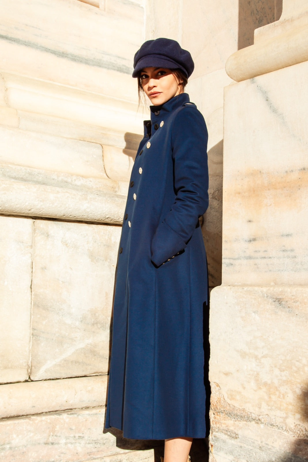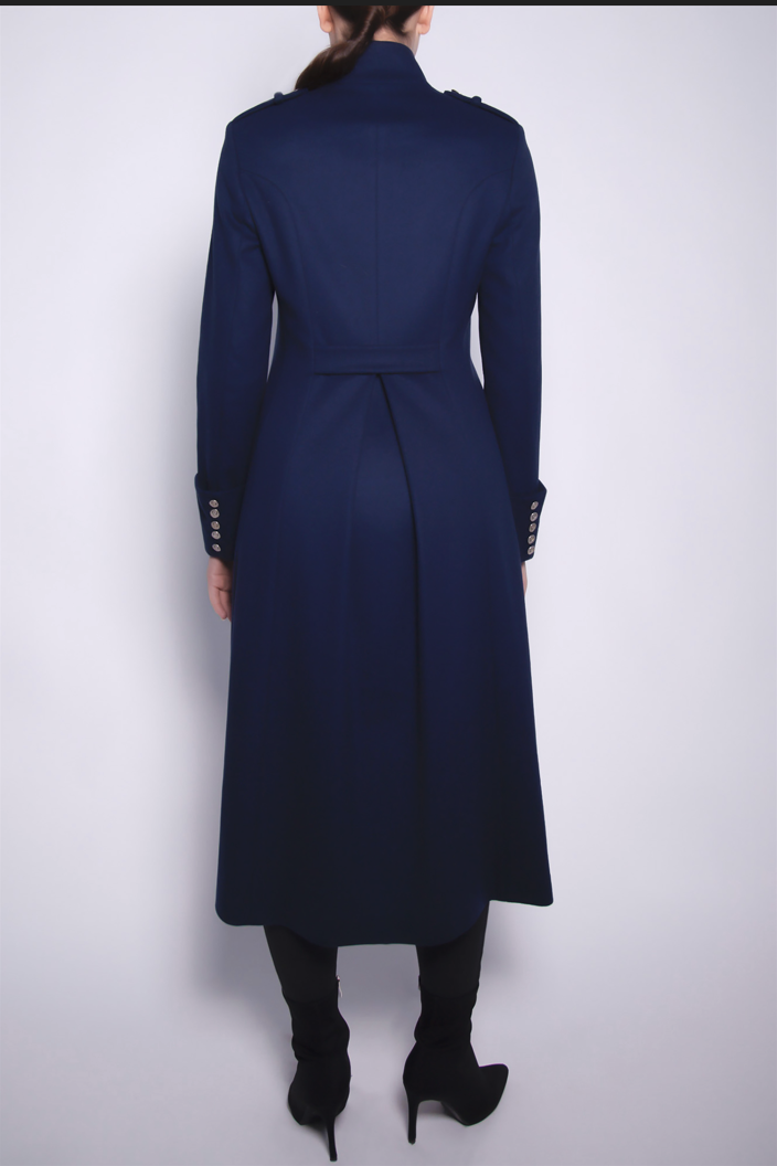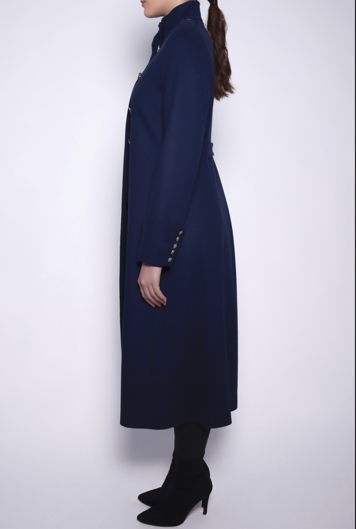 Cappotto 3/4 taglia S, realizzato con un'elegante combinazione di tessuti pregiati: 90% pura lana vergine e 10% cashmere. Fodera interna blu in 90% poliestere e 10% elastan per un comfort ottimale. Il taglio affiancato valorizza la silhouette, completato da tasche funzionali e una martingala.