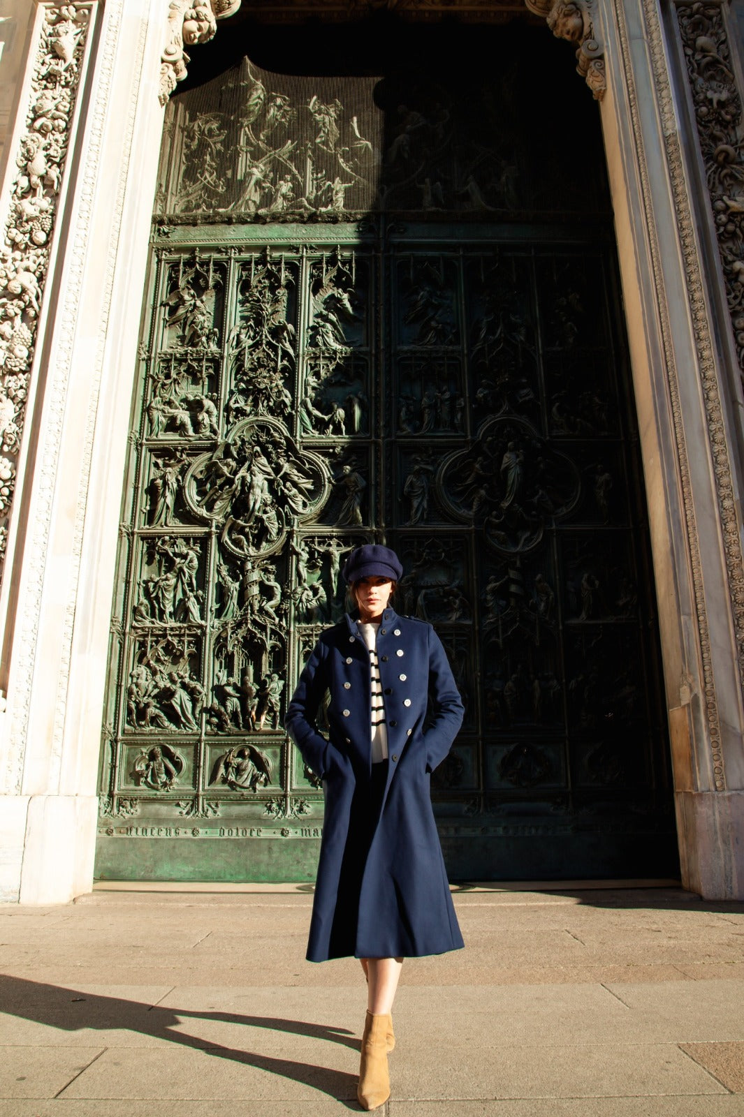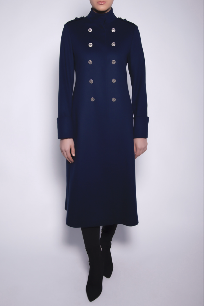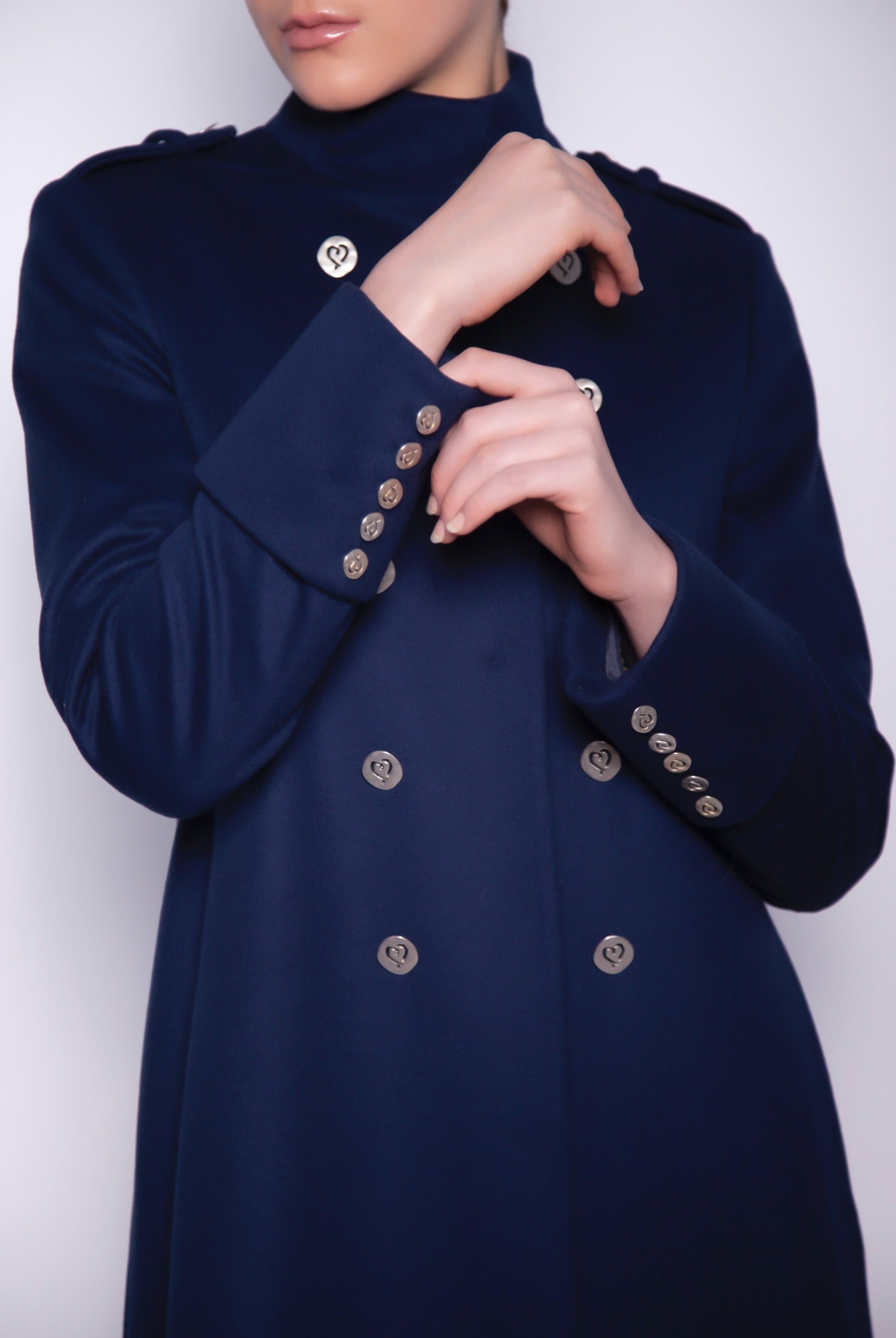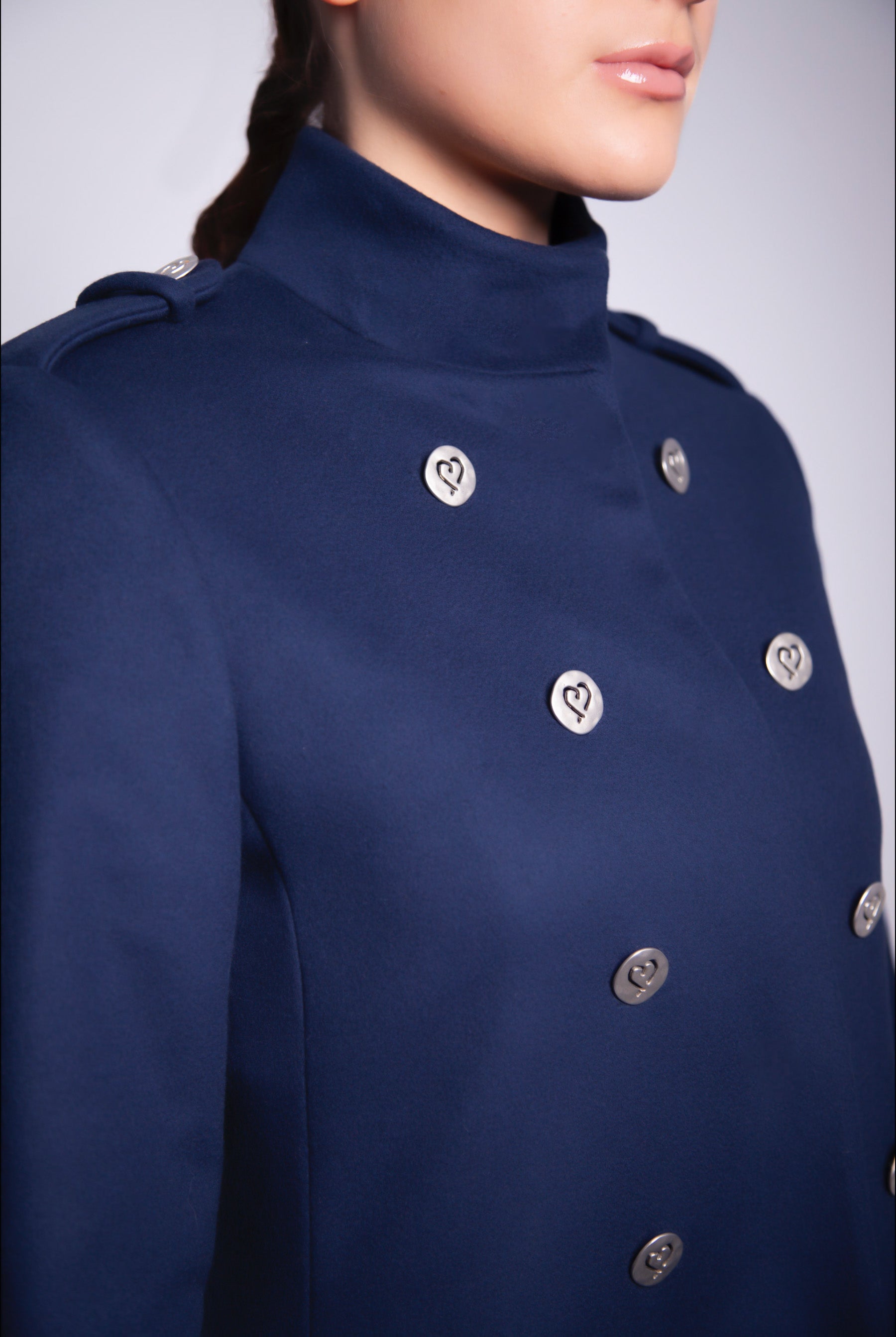 Chiusura con abbottonatura nascosta e bottoni automatici rivestiti in tessuto, impreziositi da dettagli finto doppiopetto con bottoni semi-artigianali in metallo color argento. Richiami di stile presenti anche sui risvolti delle maniche e sugli spallini, per un tocco di classe senza tempo.