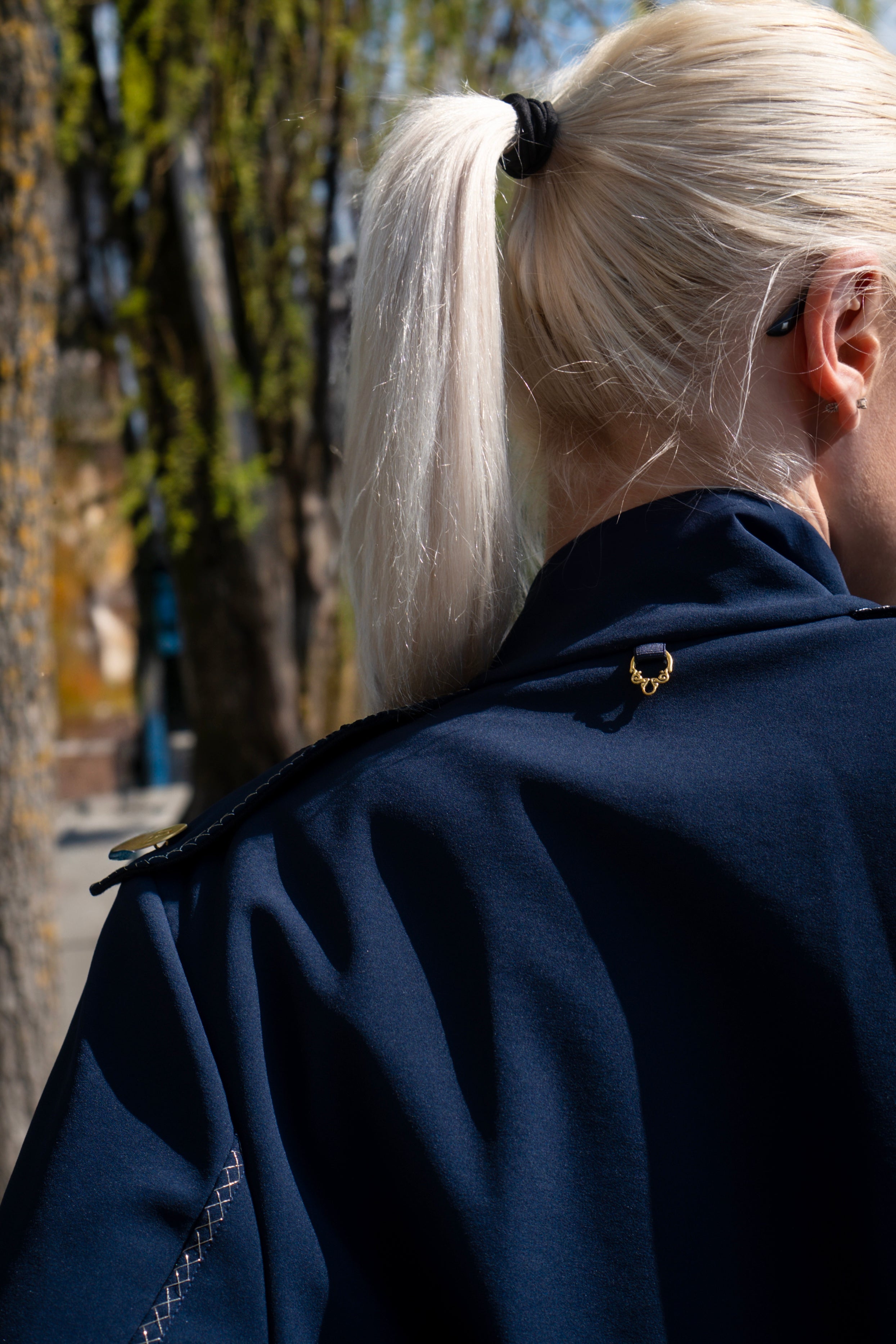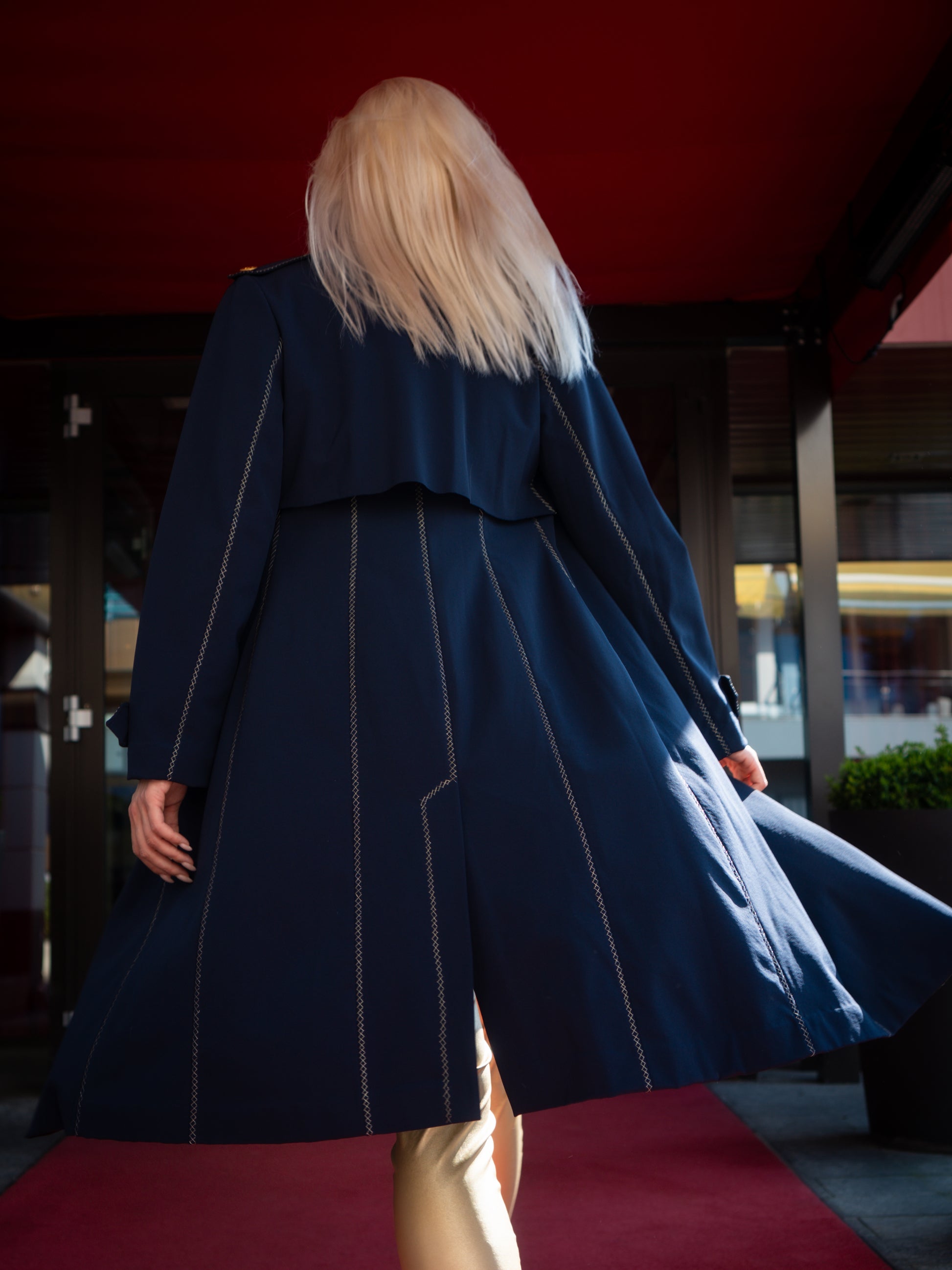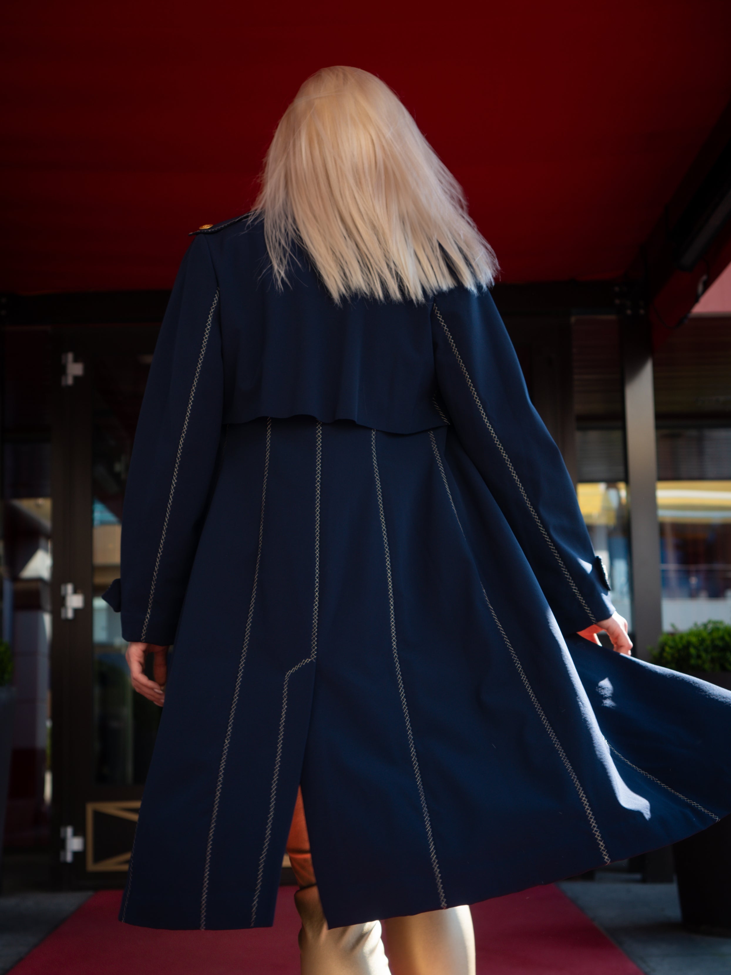 Capospalla realizzato in tessuto tecnico idrorepellente all’esterno, accoppiato internamente a pregiata lana merino per garantire comfort termico e traspirabilità. Taglio classico stile trench con tasche laterali integrate nel design. Chiusura frontale con bottoni in ferro battuto dorati. Rifinito con 1200 cm di ricamo in filo dorato, eseguito artigianalmente.Il tessuto è completamente naturale, fuori produzione, ottenuto attraverso una lavorazione ecoresponsabile con elementi derivati dall’oca e senza impatto ambientale. Una scelta sostenibile che unisce eleganza, funzionalità e rispetto per la natura.